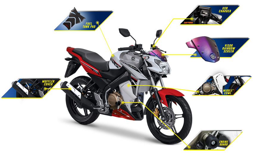 Gilmoters penasaran kan aksesoris apa saja yang terpasang pada New V-Ixion Advance Special Edition ini? Adapun perangkat tambahan tersebut antara lain fuel tank pad, USB charger, visor rainbow screen, middle cowl, engine guard, muffler cover.