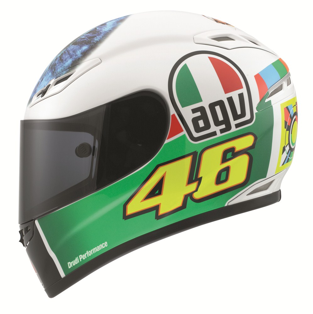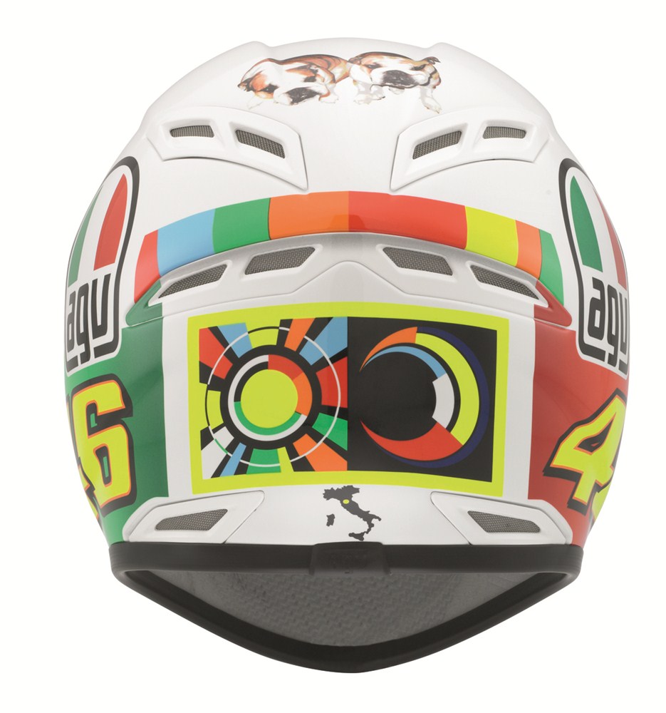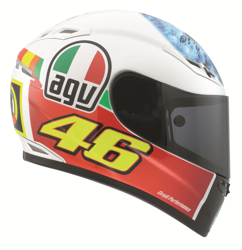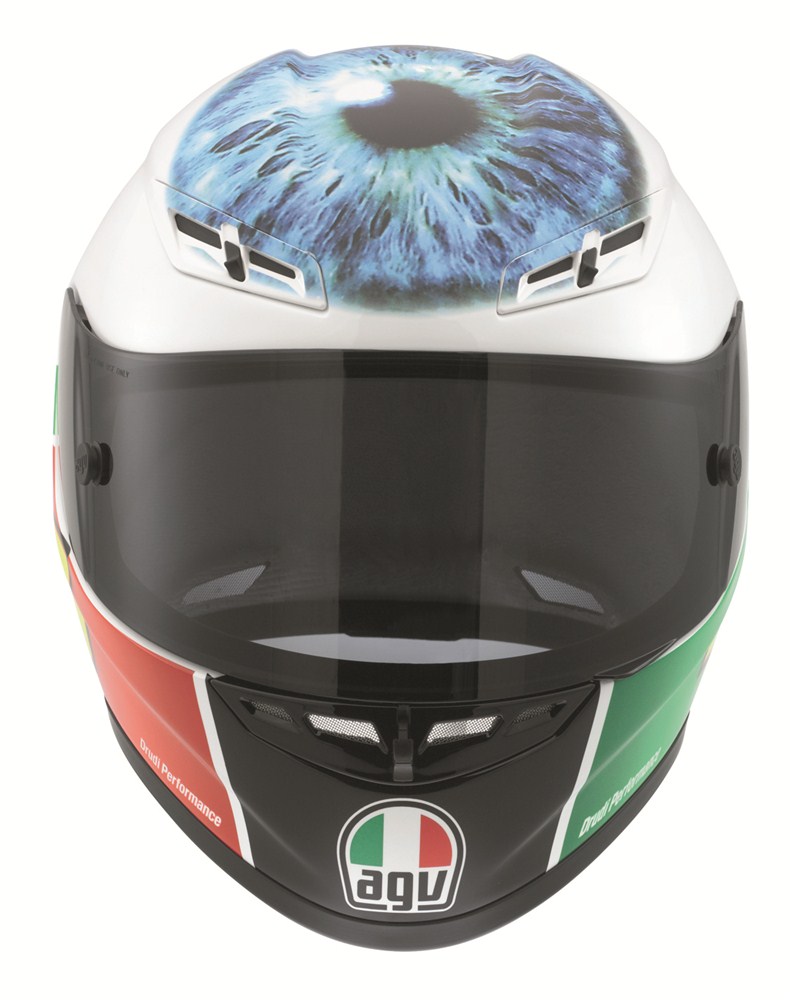 Desain grafis helm yang menggambarkan bola mata Rossi berwarna biru dan bendera Italia, dikembangkan AGV bersama dengan Aldo Drudi. Helm ini hadir sebagai kolektor item untuk mereka para penggermar MotoGP khususnya Valentino Rossi.