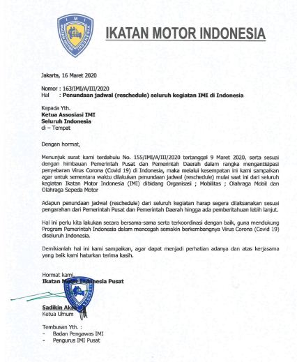 Sebagai informasi tambahan surat edaran yang dikeluarkan oleh Ikatan Motor Indonesia (IMI) tertanggal 20 November 2020 dengan nomor 479/IMI/A/XI/2020, justru tidak membuat event balap Jabar Open 2020 tertunda. Event yang berlangsung (22/11) justru berlangsung lancar dengan mengedepankan protokol kesehatan Gilmoters. Bagaimana menurut kalian?