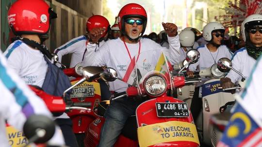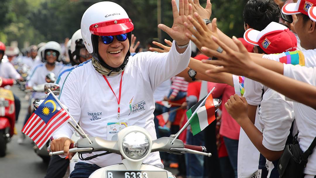 Sekitar 250 Vespa ambil bagian untuk mengiringi para pelari yang melintasi lebih dari 50 titik di wilayah Jakarta Utara, Jakarta Selatan, Jakarta Pusat – Barat hingga Jakarta Timur. Keterlibatan Vespa dalam kegiatan kirab obor ini merupakan bentuk nyata dukungan PT Piaggio Indonesia untuk memeriahkan dan mendukung suksesnya ajang olahraga internasional ini.