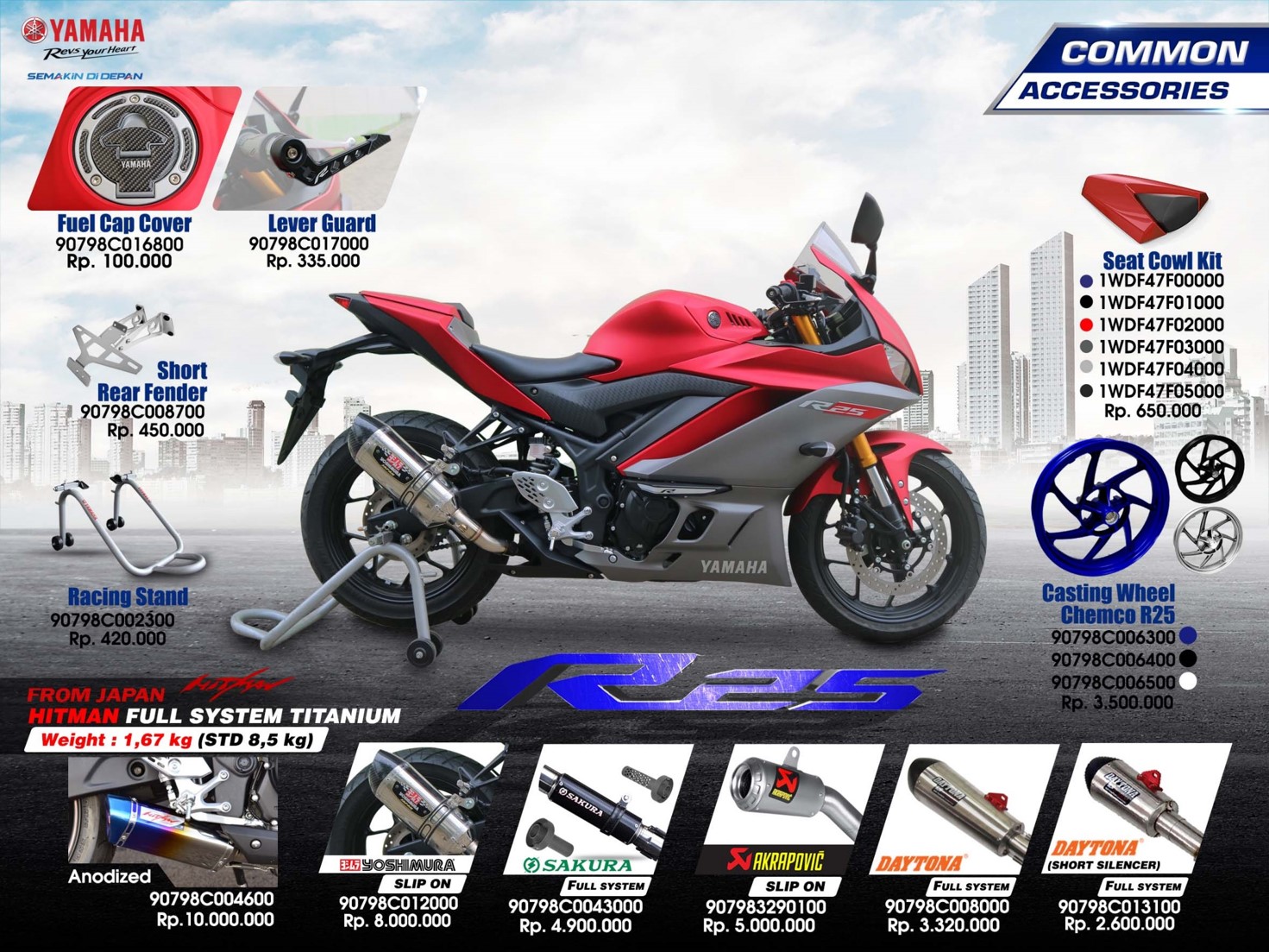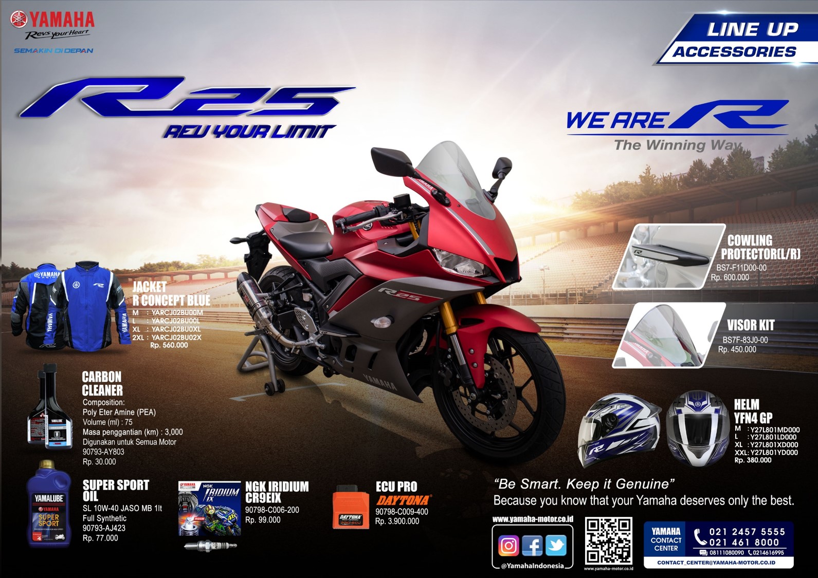 PT Yamaha Indonesia Motor Manufacturing (YIMM) menyediakan aksesori untuk mengangkat tema R-Concept. Penasaran ada komponen apa saja? Berikut daftar aksesori dan apparel Yamaha R25.