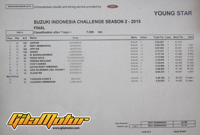 Rexy Desmanaga akan mendampingi Jakfar mewakili wilayah Jatim pada perhelatan grand final SIC nanti. Hasil balap Young Star Cup SIC Surabaya :