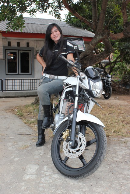 GILAMOTOR.com. – Cewek yang satu ini memang tidak memiliki pengalaman yang mumpuni dalam hal berkendara motor, dari 100 member Vixion Riders Jakarta (V-Riders) cewek hitam manis ini satu-satunya lady bikers di V-Riders Jakarta.