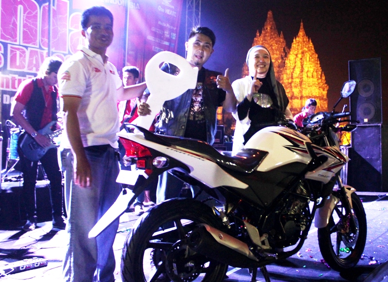 GILAMOTOR.com. – Ini yang namanya “ketiban bulan†alias rejeki nomplok. Niat cuma mau kumpul sekalian silaturrahmi bareng ribuan pengguna motor Honda di acara Honda Bikers Day (HBD) 2012 di lapangan Siwa Candi Prambanan akhir pekan kemarin, Bro Ricky Yoga malah dapet motor baru. Cowok yang gabung di klub Solidarity Honda Tiger Bogor (SHOT-B) ini langsung membawa pulang All New Honda CB150R. Gratisss broo.. Sedep gak tuhhh..?