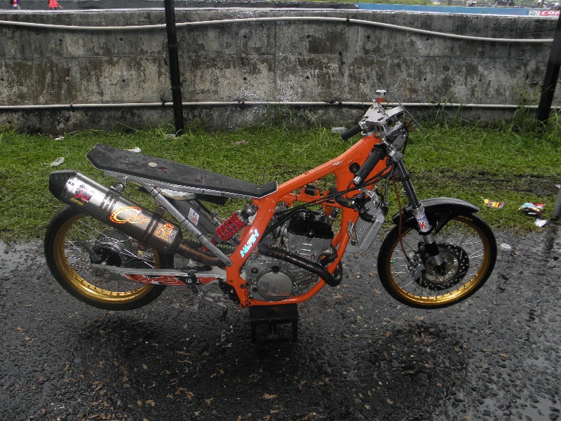 “Sebenarnya pionir bukan kita, tim Angker dan Kolor Ijo sudah pertama,†kata Randy. Jadi basic SE si KTM harus down grade menjadi sport draglook, pelek diganti Takasago 120×17 dan 215×17 dikombinasikan sok YSS.