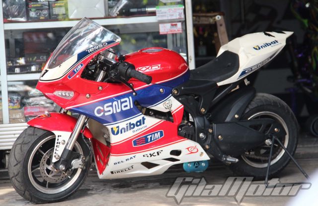 Bagaimana tidak, sosok pocket bike yang didatangkan langsung dari Negeri Gajah Putih ini tampak seperti Ducati Panigale namun dalam versi mini Gilmoters. Dan tidak seperti pocket bike yang biasa wara-wiri yang bermesin 2 tak, mocil ini dibekali mesin 50 cc 4 tak. Selain itu, sektor pengereman sudah mengadopsi double disc brake.