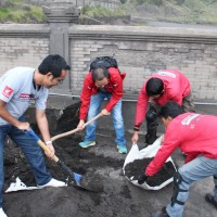 Setelah disambut oleh para pemangku adat masyarakat Tengger, rombongan ekspedisi Nusantara Satu Hati untuk Negeri bergotong royong membersihkan pasir yang menutupi Lantai Pura yang biasa dipakai upacara Kasada ini.