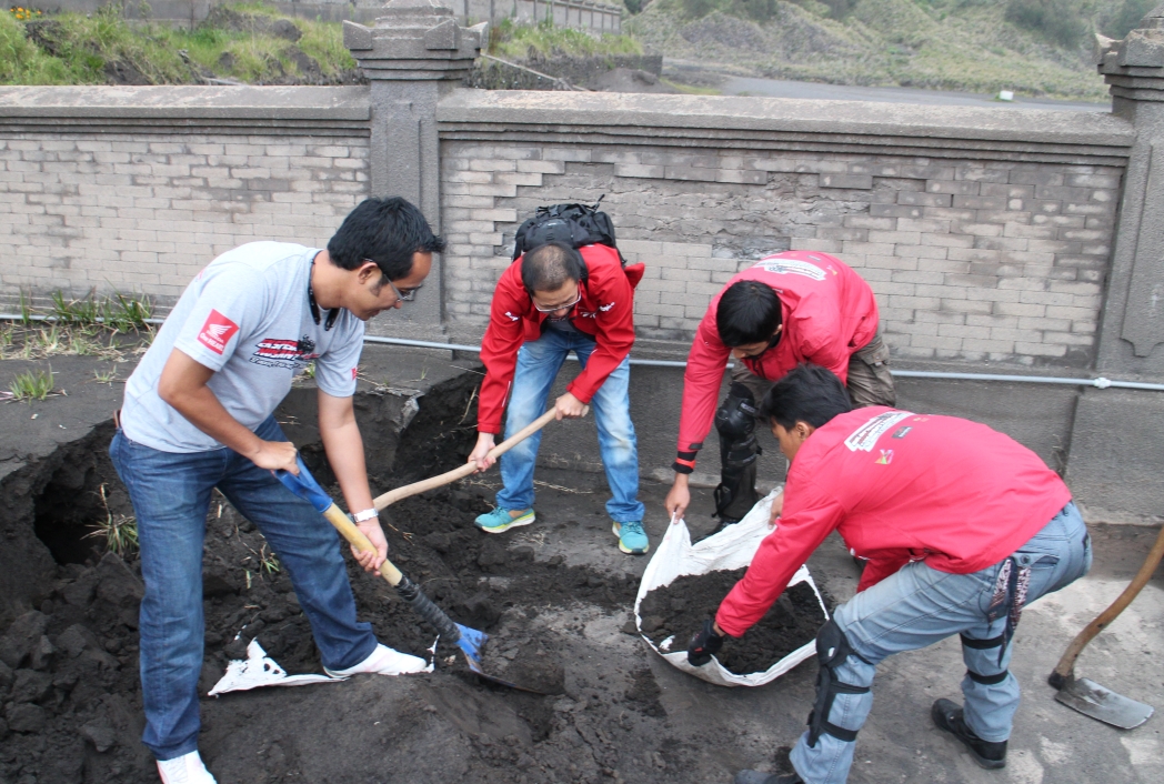 GILAMOTOR.com – Touring lintas tiga pulau yang digelar PT Astra Honda Motor (AHM) memang bukan sekedar perjalan menguji ketangguhan motor. Saat melintasi kawasan Bromo, rombongan melakukan kegiatan sosial membersihkan Pura Luhur Poten yang tertutup pasir akibat erupsi gunung berapi aktif ini.