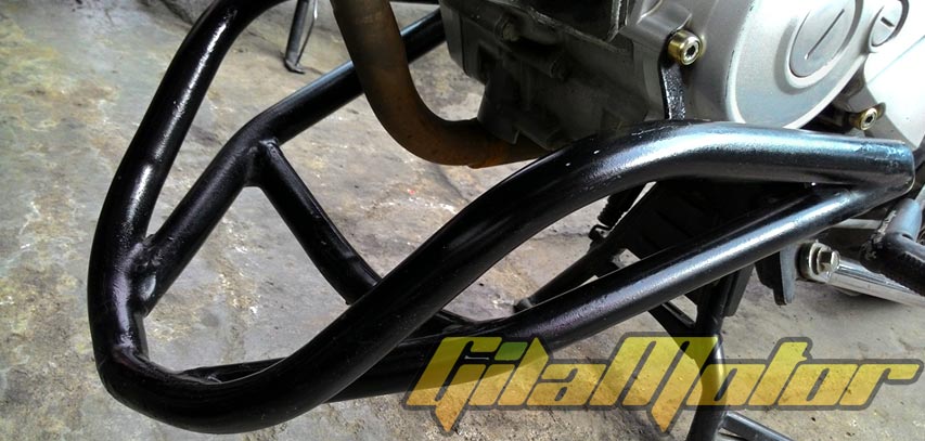 Hasilnya, selain menambah kesan sangar, berkat bahan besinya yang kokoh aplikasi engine guard ini juga bisa melindungi mesin saat terjadi benturan.