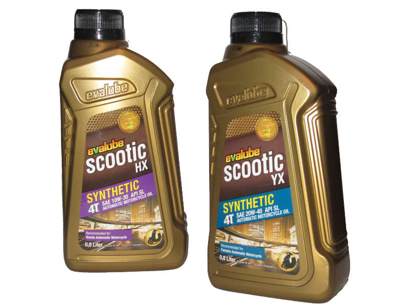 Evalube Scootic HX dengan spesifikasi SAE 10W-30, API SL/JASO MB adalah pelumas yang dari bahan dasar sintetik yang dilengkapi aditif Molydenum Dithiocarbonat) yang berfungsi mengurangi friksi sehingga perpindahan gigi lebih halus, memperpanjang umur mesin dan tentu saja akan meningkatkan efisiesnsi konsumsi bahan bakar.
