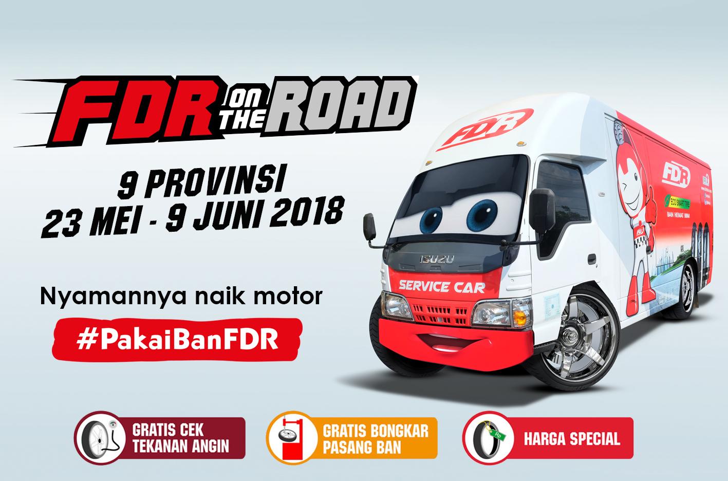 Untuk itulah, tahun ini FDR kembali menggelar program bertajuk FDR On The Road. Memasuki tahun ketiga, program yang menggunakan FDR Service Car ini akan parkir di sejumlah lokasi Gilmoters. Sehingga pengendara sepeda motor dapat membeli ban FDR dengan mudah.
