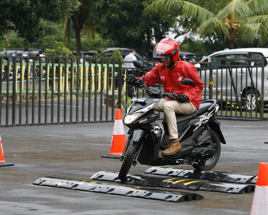 Saat melewati rintangan cone yang berjajar rapi, Bang Gilmot tidak kesulitan tuh melewatinya. New Honda BeAT Street eSP dengan mudah meliuk-liuk melewati rintangan tersebut. Namun kekhawatiran Bang Gilmot menjadi kenyataan Gilmoters. Siku Bang Gilmot mentok paha saat melakukan belokan yang agak patah. Kini giliran melahap rintangan jalan bergelombang, pelan tapi pasti New Honda BeAT Street eSP dapat melewatinya tanpa kendala.