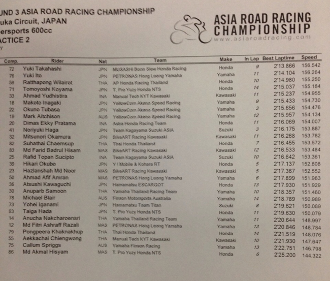 Yuki Ito, Ratthapong Wilairot dan Tomoyoshi Koyama ada di bawahnya. Hasil positif juga didapat Ahmad Yudhistira. Lap time 2 menit 15,237 detik membuatnya ada di urutan 5.