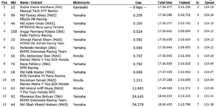 Kemenangannya tidak direbut dengan mudah, terutama berkat hadangan wakil-wakil Malaysia, seperti Md Fareez Afeez dan Md Azam Omar. Sama seperti seri-seri balap Underbone 130, persaingan untuk memperebutkan posisi terdepan selalu ketat. Pergantian pimpinan lomba kerap terjadi tiap lap.