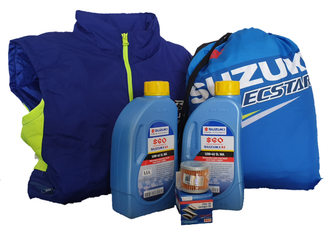 Paket selebrasi ini dikemas dalam tas serut multi fungsi yang di dalamnya terdiri dari Rompi team Suzuki Ecstar, pelumas Suzuki 2 botol, dan oli filter Suzuki Motor.