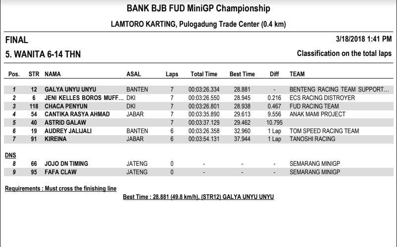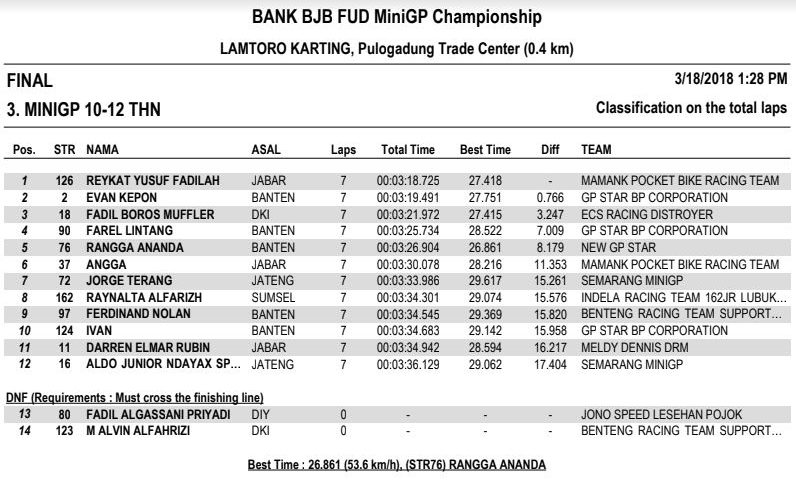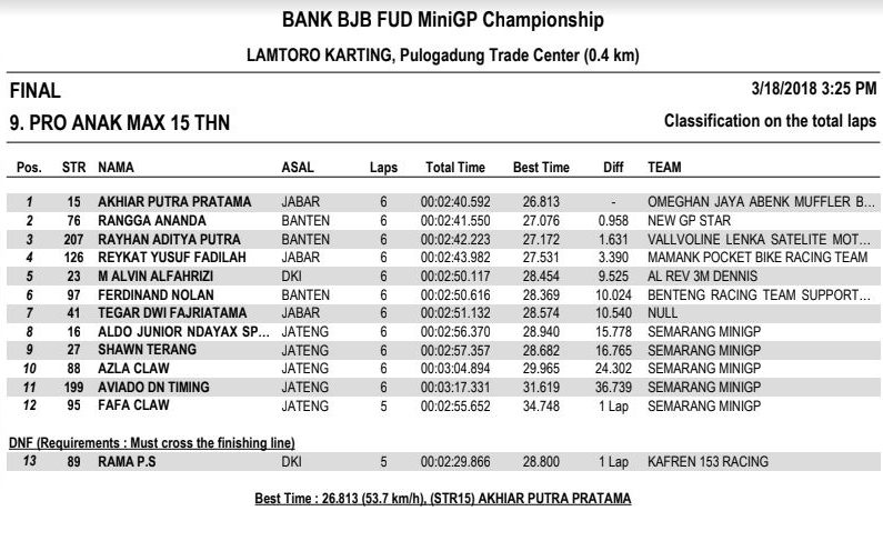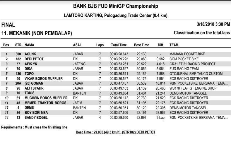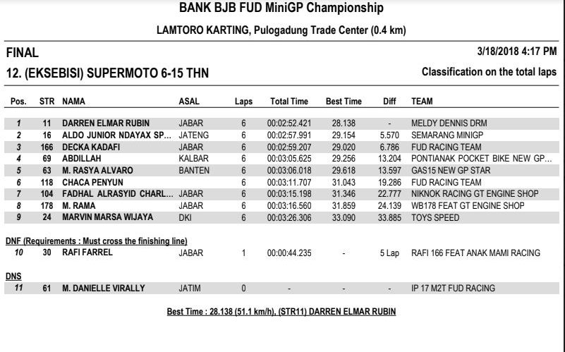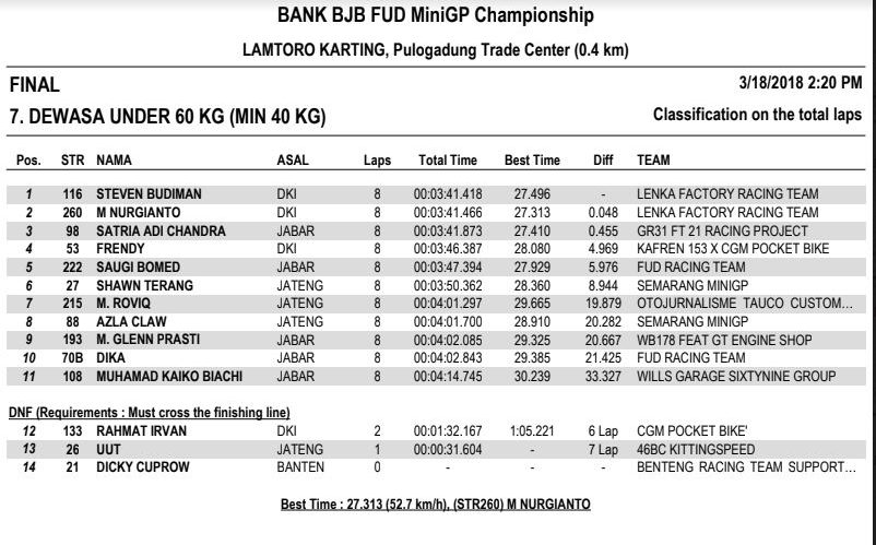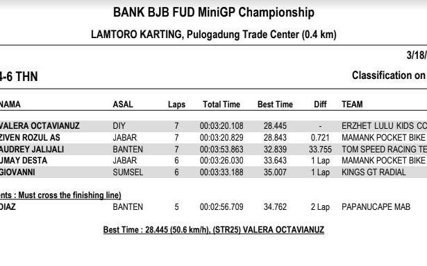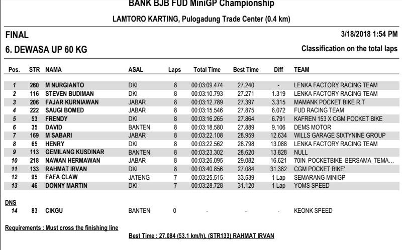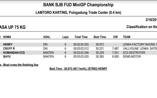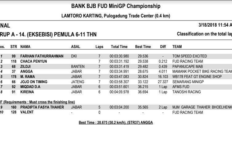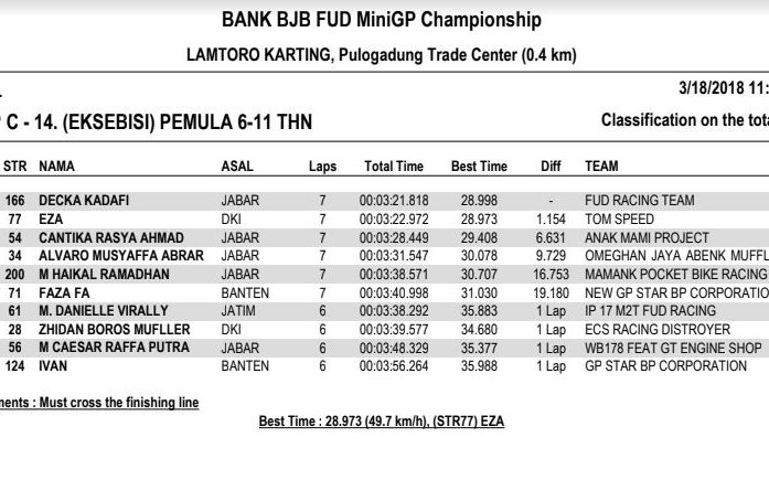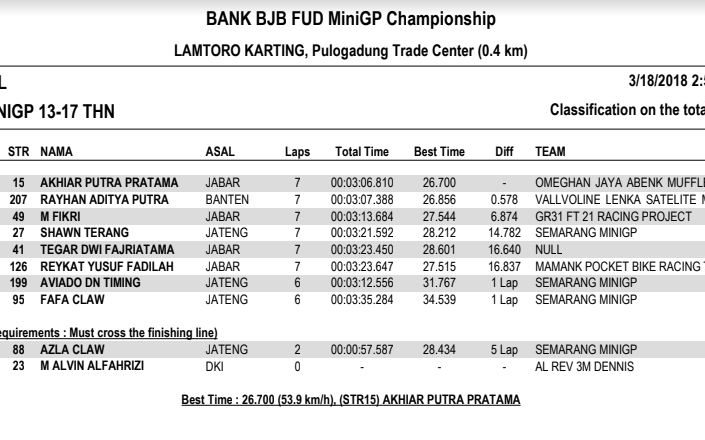 Nah dari seluruh kelas yang diperlombakan, tentunya ada masing-masing juaranya. Berikut hasil resmi BJB FUD Championship 2018 Seri 1. (okz)