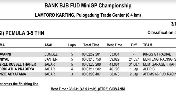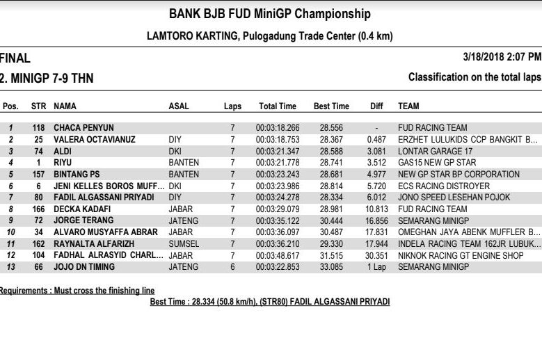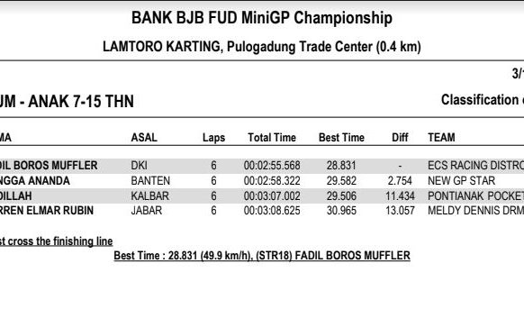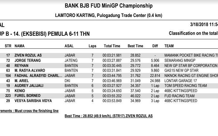 Gilamotor.com – Sikuit Lamtoro Karting, Pulogadung Trade Center, Jakarta Timur (18/3) menjadi lokasi dibukanya rangkaian kejuaraan balap MiniGP bertajuk BJB FUD Championship 2018. Di seri perdana ini ratusan starter yang terdiri dari pembalap profesional maupun pemula turun berlaga.