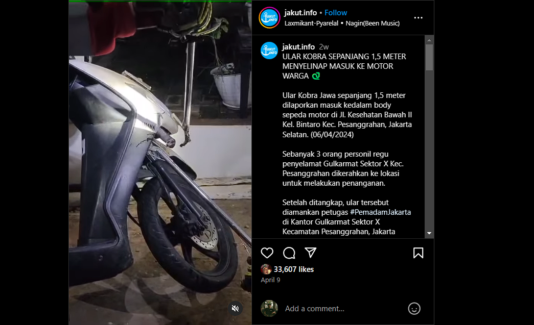 Seperti dalam sebuah video viral di Instagram yang diunggah oleh akun @jakut.info pada awal April lalu. Dalam video tersebut tampak sebuah ular kobra sepanjang 1,5 meter bersarang di sebuah motor matic.Â