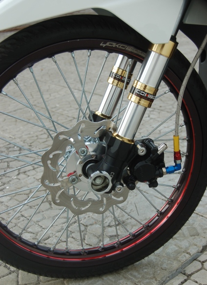 Biar kaki kelihatan lebih aksi, cakram depan asli dilengserkan dan Panom Racing 190 mm dijadikan pengganti. Begitupun pemasangan pemundur sok belakang produk Panom Racing Adjustable hingga leher knalpot ambil merek Tsukigi.