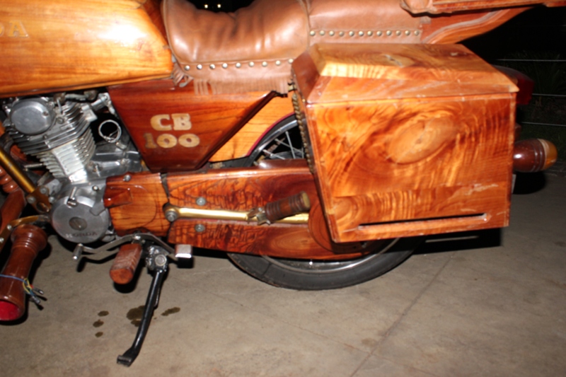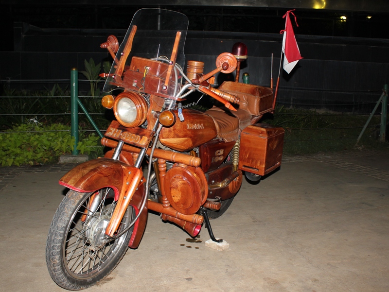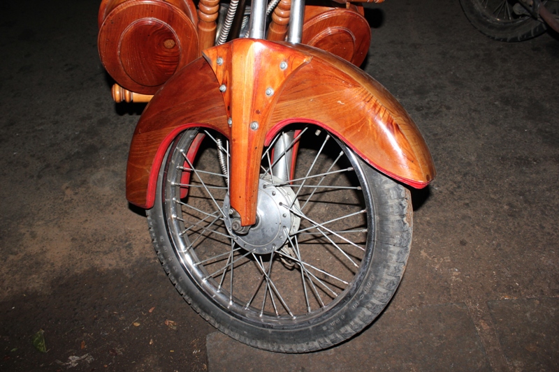 Meski kayu-kayu itu hanya dijadikan sebagai cover saja, tapi pengerjaan yang ciamik, membuat motor kayu itu mampu memberikan daya tarik tersendiri.