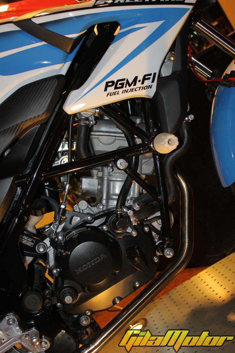 Kalau mesinnya nggak ada yang dioperek. Masih perjaka tulen. “Tak ada yang berubah. Kita pakai mesin standar. Hanya penambahan piggybag untuk pengaturan mapping injeksinya dan mengatur limiter-nya,†terang Anggono Iriawan, Manager Motorsport PT AHM.