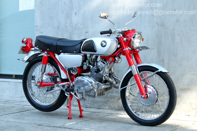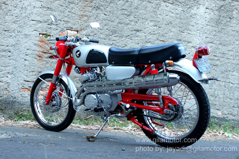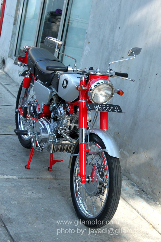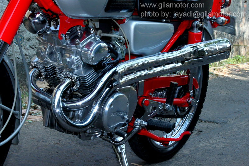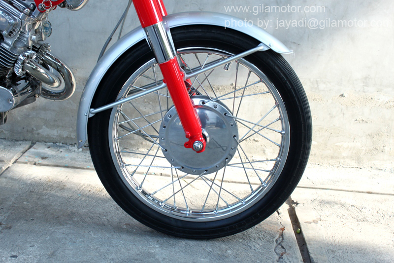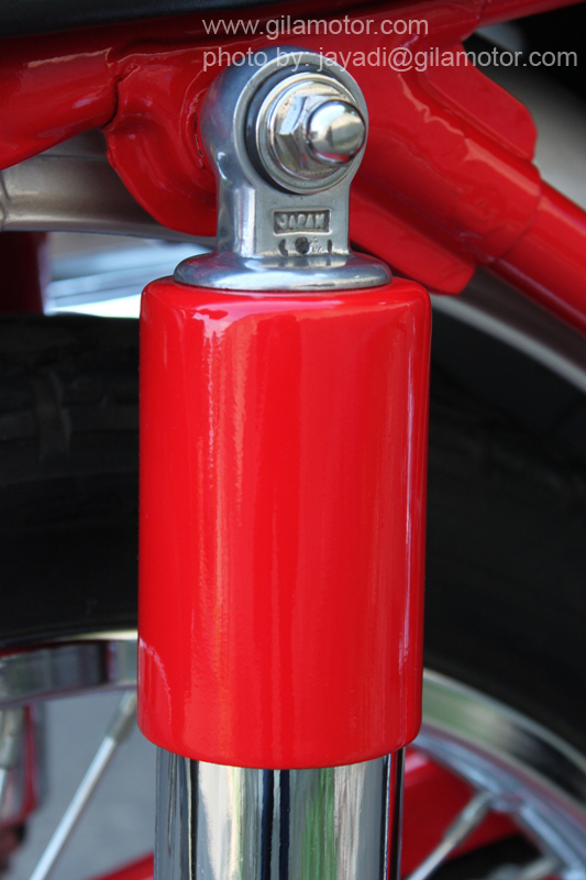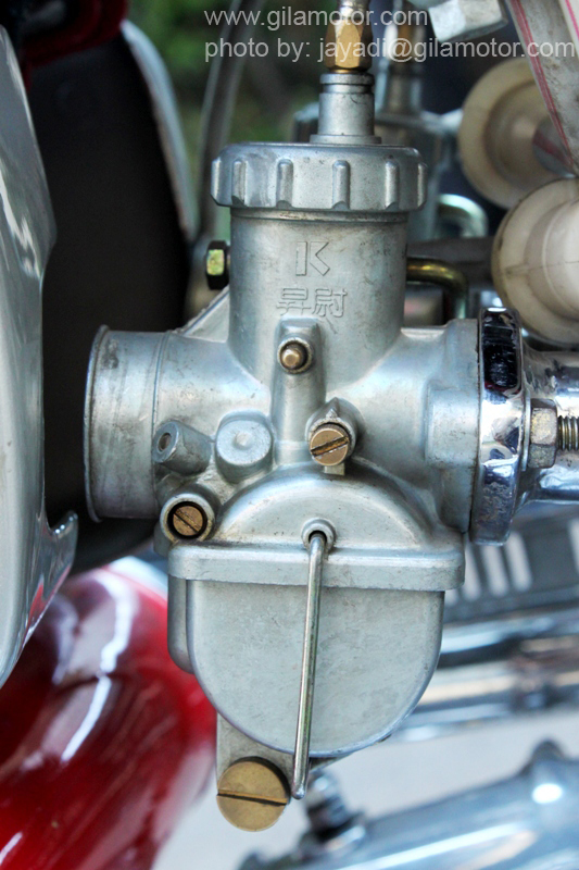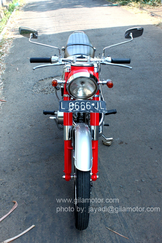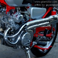 Warnanya merah dan chrome, hasil restorasinya apik, mulus. Motor yang terkesan klasik ini milik Heret Frasthio. Kata Ucup, sapaan Yusuf Abdul Jamil, beberapa komponen dibawa langsung dari Jepang oleh pemiliknya macam kenalpot, jok dan tangki. “Knalpot, jok dan tangki dia bawa dari sana. Soalnya tiga perangkat itu bikin hitungan jadi pas,†kata Ucup.