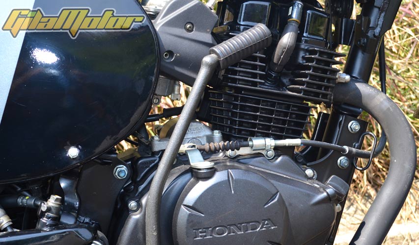 Selanjutnya pengerjaan tangki dari galvanis 0,9 mm serta dudukan side number ala cafe racer. Tak lupa, jok kita buat model hornet agar masih bisa membonceng, tapi tetap memiliki nuansa racer. Sedangkan headlamp dibuat custom dengan desain bulat.