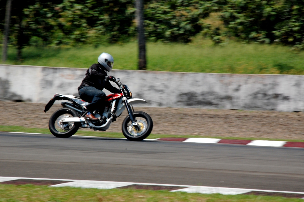 BOGOR.- Si Jangkung Husqvarna 510 SMR yang diboyong PT. Sentra Kreasi Niaga (SKN) selaku ATPM Piaggio dan Aprilia di Indonesia ke sirkuit Sentul Internasional, Bogor, Jawa Barat (1/5) bersamaan even Aprilia Track Day, cukup menggoda para undangan yang hadir.