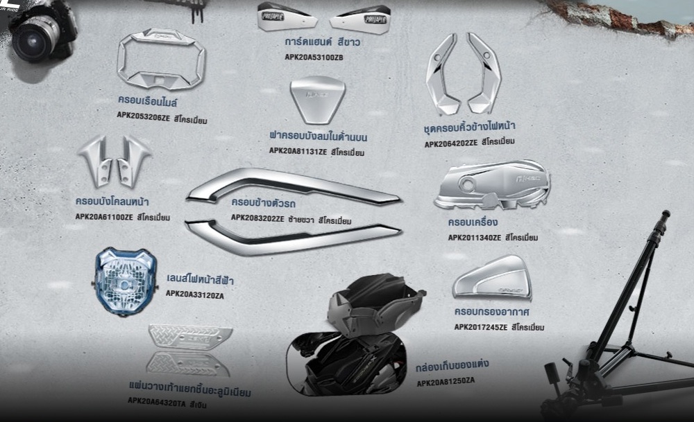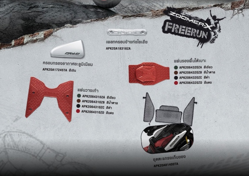 Zoomer X yang hadir beberapa waktu lalu di Negeri Gajah Putih Thailand dengan konsep desain yang berani, unik dan sporti, pun menyediakan paket komponen aksesoris yang disesuaikan dengan target dan karakter konsumen Zoomer X.