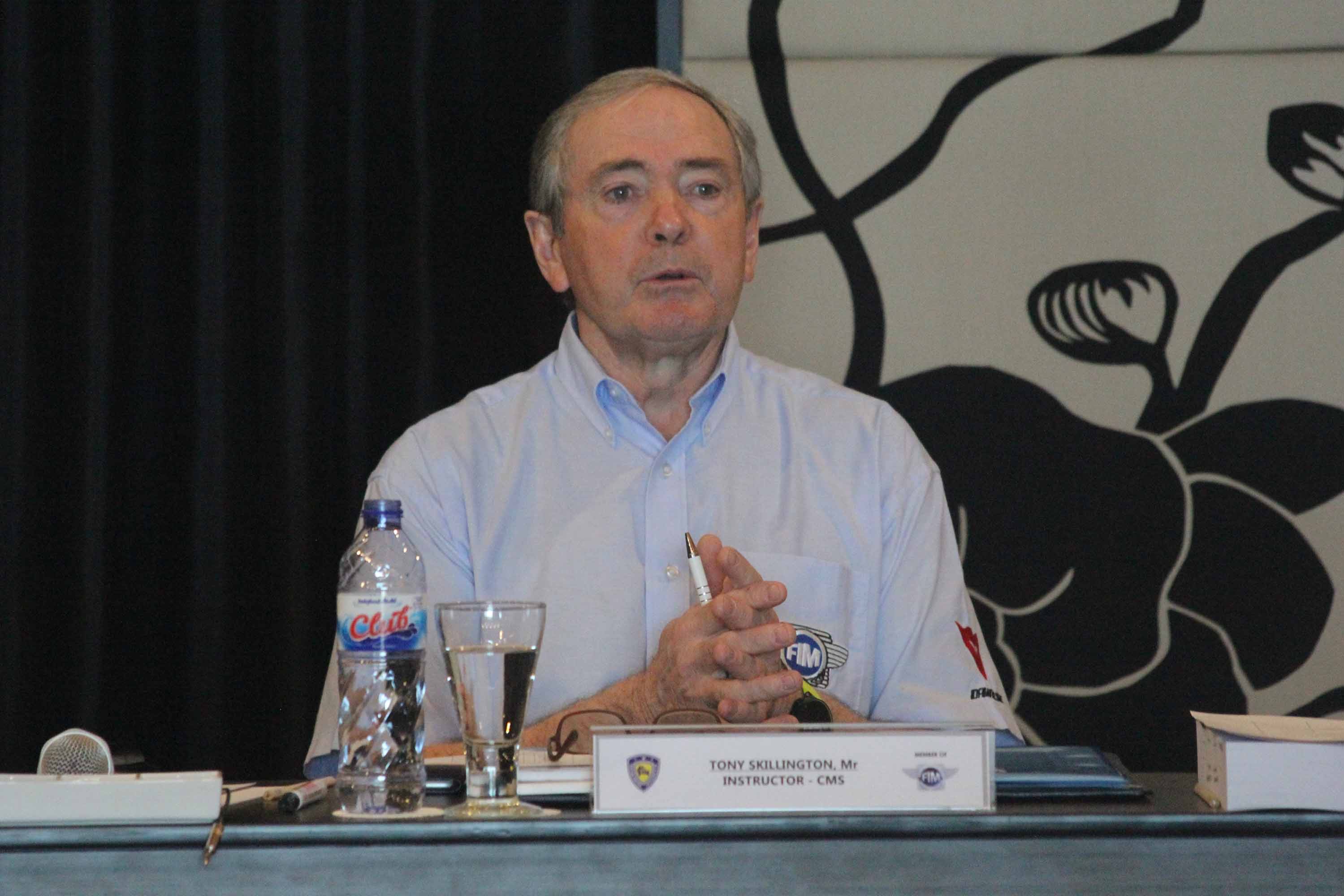 Yang pertama dari Tony Skillington selaku FIM Motorcross Commision Director yang turun langsung menjadi penbicara seminar Motocross Commission Clerk of the Course / Sporting Steward (CMS). Beberapa hal yang menjadi pokok bahasan Skillington adalah bagaimana menyusun struktur organisasi komisi olahraga motocross menjadi ideal. Lebih lanjut lagi, ia juga menegaskan mengenai hak dan kewajiban yang dimiliki oleh seorang pengawas perlombaan. Selain itu, ia juga banyak berbagi cerita, pengalaman serta ilmunya terkait dengan program kerja FIM yang perlu diaplikasikan dalam perlombaan di Indonesia.