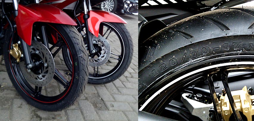 Yup. Di bagian depan, terdapat velg 1.85 berbalut ban 70/90-17. Sementara di belakang, velg 2.50-nya dibalut ban bertapak 120/70-17. Ditengok dari bentuk pentilnya yang panjang, maka bisa dipastikan jika motor ini memakai ban tipe tubeless.