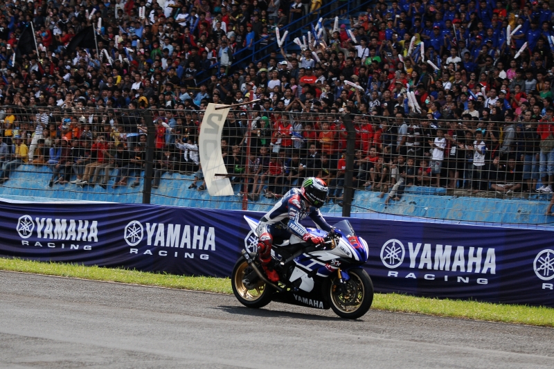 GILAMOTOR.com – Salah satu suguhan Yamaha Asean Cup Race (YACR) 2013 adalah hadirnya pembalap Yamaha Factory Racing, Jorge Lorenzo, untuk melakukan demonstrasi dengan YZF-R6 di hadapan sekitar 10 ribu penonton pada 1 Desember 2013 kemarin.
