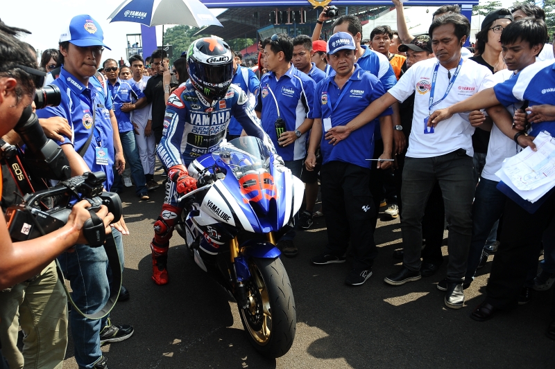 Kehadiran Lorenzo di Sirkuit Sentul disambut sorak sorai para penggemarnya sambil mengibarkan bendera hitam bertuliskan angka kebesarannya 99 dan logo X Fuera. Sayangnya, situasi paddock Lorenzo kurang penjagaan sehingga trek di depan paddock yang seharusnya ‘clear area’ mendadak disesaki para penggemar yang ingin mengabadikan keberadaan Lorenzo di atas R6 dengan foto atau video.