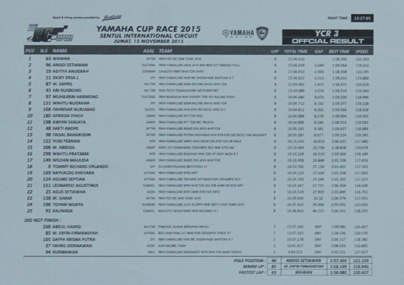 Hasil race final Yamaha Cup Race kelas YCR3 :