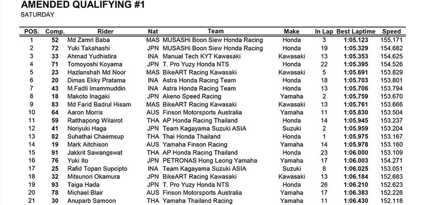 Sedangkan pole position direbut pebalap tuan rumah, Md Zamri Baba, dengan andalan Honda CBR600RR. Di posisi dua ditempati oleh mantan pebalap Moto2, Yuki Takahashi yang dikuntit ketat oleh rider Indonesia, Ahmad Yudhistira.