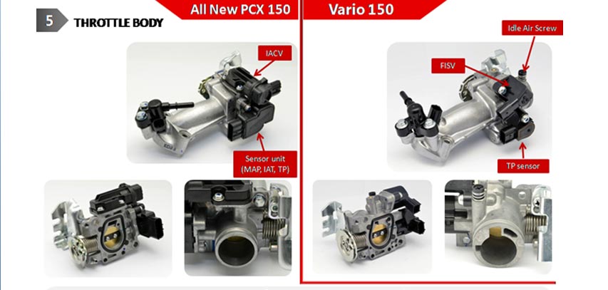 Nah, penyederhanaan hadir di piranti ini tanpa menghilangkan fungsi dan kemampuannya. Di PCX 150, throttle body nya lebih rumit dengan adanya tiga sensor yakni, MAP (Manifold Absolute Presure), IAT (Intake Air Temperature) dan TP (Throttle Position). Sementara Vario 150 eSP hanya mengandalkan TP.