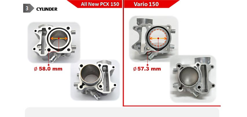 “Ini karena ukuran bore piston PCX 150 lebih besar, yakni 58mm dan Vario 150 eSP hanya 57,3mm. Sedangkan ukuran langkah dan kompresi masih sama, yakni 57,9mm dan 10,6:1,” ungkapnya.