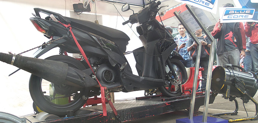 Yamaha Mio M3 125 itu ditempatkan di dynotest dengan posisi roda belakang berputar. “Motor diikat dan tetap punya beban tambahan 60 kg. Jadi, analoginya itu adalah beban pengendara,” tambah Ibrohim, Service Advisor CBU model DDS.