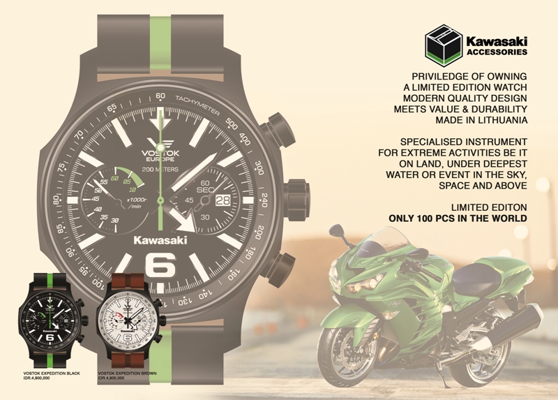 Untuk jam tangan keren dari Vostok seharga Rp 4.9 juta, cuma dipasarkan Kawasaki sebanyak 100 unit saja. Ada dua warna yang ditawarkan Kawasaki, Vostok Expedition Black dan Vostok Expedition Brown. Keduanya dipasarkan dengan harga sama.