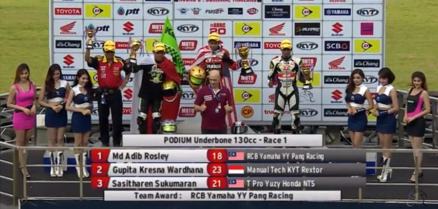Sementara tempat ketiga diisi oleh Sasitharen Sukumaran. Dua rider Indonesia, Roy dan Anggi harus puas menyelesaikan balapan di urutan 4 dan 6.