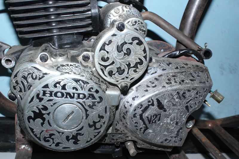 Bergaya grafir unik dan keren, terlihat sangat Indonesia banget bro. Beberapa bagian motor yang menggunakan plat digrafir dengan aksen batik, mulai dari bagian mesin di bagian bak kopling, bak magnet, tutup rantai, tutup noken as dan rumah stater.
