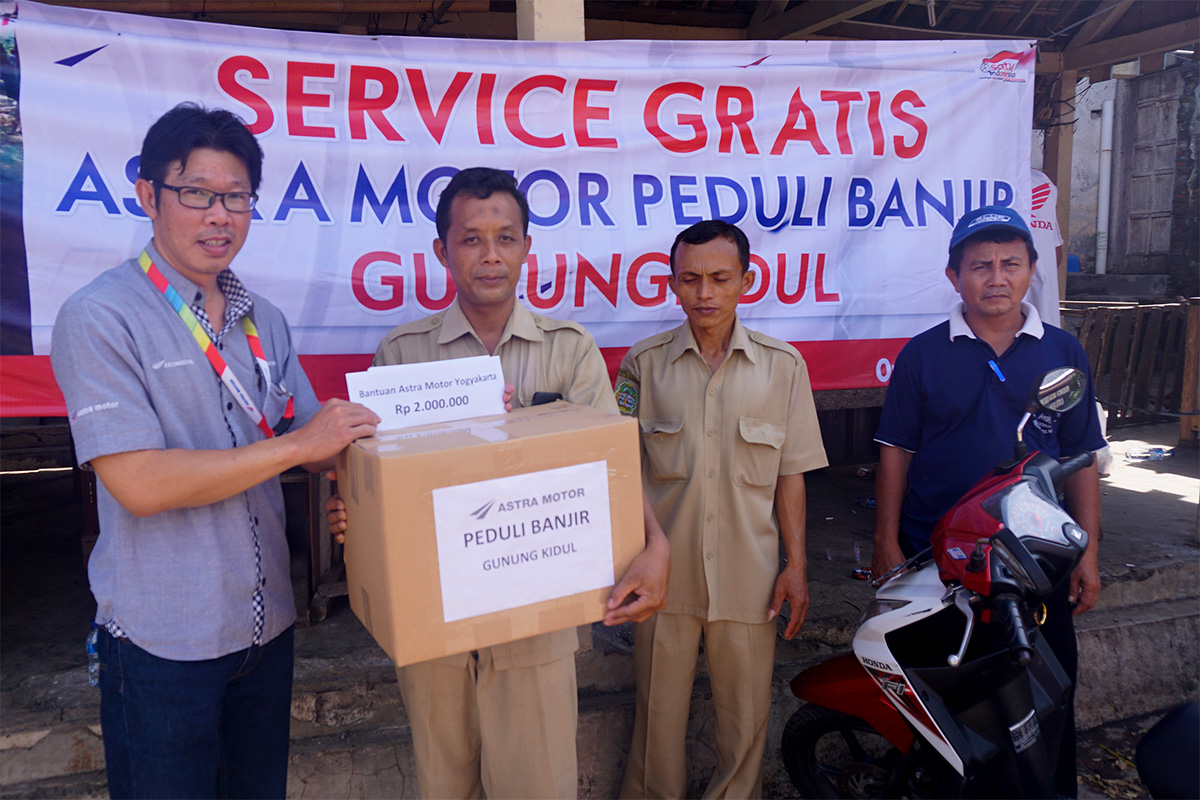 Selain memberikan layanan servis gratis sepeda motor Honda pada warga yang terdampak banjir, pada kesempatan yang sama sebagai bentuk perhatian dan kepedulian Astra Motor Yogyakarta juga memberikan bantuan dalam berbagai bentuk mulai dari peralatan sekolah, pakaian pantas pakai, hingga kebutuhan sehari-hari.