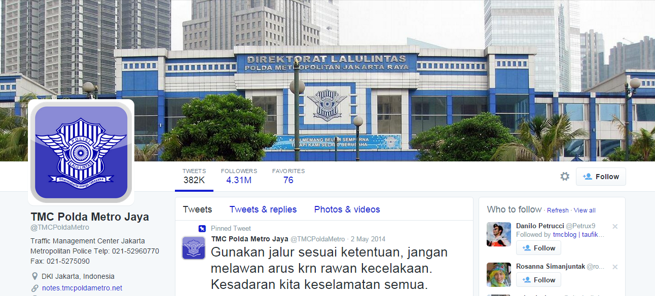 Beberapa akun sosial media yang cukup aktif memberikan informasi situasi jalan raya di Indonesia diantaranya adalah @TMCPoldaMetro. Akun resmi milik Direktorat Lalulintas Polsa Metro Jaya paling aktif memberi informasi mengenai situasi dan kondisi lalu lintas. Informasi yang diberikan bisa langsung dari akun TMC Polda atau meneruskan atau retweet dari masyarakat yang menginformasikan kondisi lalulintas yang mereka lalui.