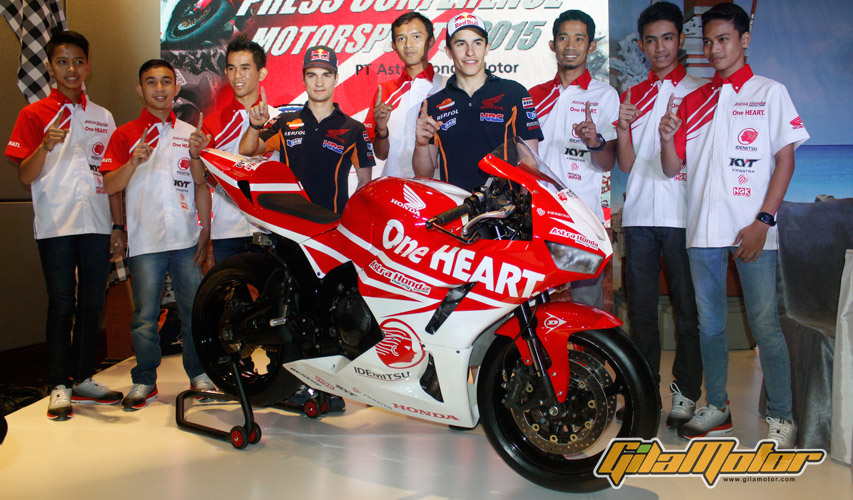 GILAMOTOR.com – Dukungan kepada para rider muda Indonesia binaan PT Astra Honda Motor (AHM) terus mengalir. Pun begitu dengan dua pebalap Honda di MotoGP.Bersamaan dengan dibukanya livery baru Honda MotoGP 2015 di Nusa Dua, Bali, Minggu (1/2/2015), Marc Marquez dan Dani Pedrosa juga menyampaikan ‘wejangan’ untuk mereka.