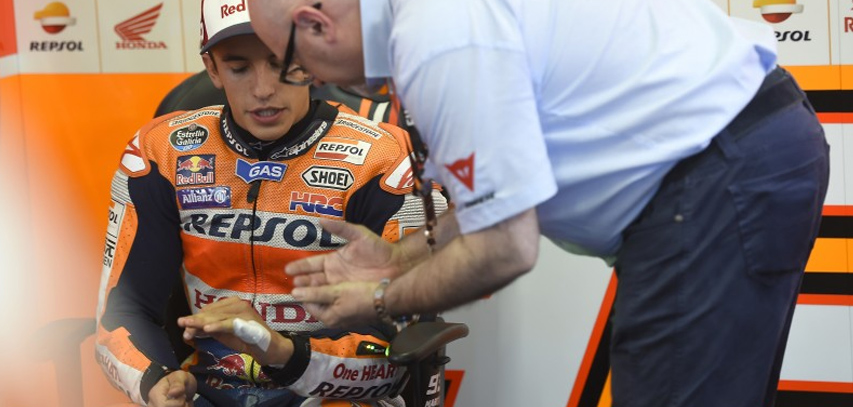 GILAMOTOR.com – Marc Marquez kesakitan saat menjalani sesi latihan bebas MotoGP Jerez, Spanyol, kemarin (1/5/2015). Namun, dirinya tetap bisa masuk dalam deretan rider teratas.