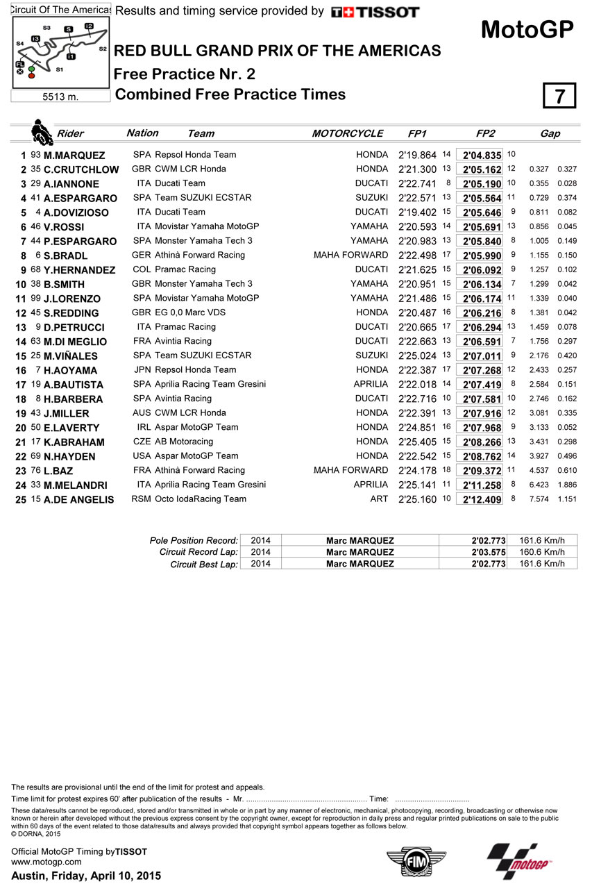 Akan tetapi, Marquez membalasnya di FP2. Merasa lebih percaya diri dengan trek yang mulai kering, Marquez tampil mendominasi. Kali itu, rider tim Honda tersebut mencatat lap time 2 menit 04,835 detik. Ini membuatnya berdiri sebagai pemuncak latihan hari pertama.