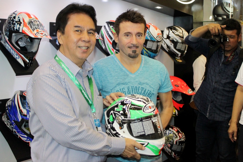 Kedatangan Biaggi ke IMOS atas undangan PT. Tarakusuma Indah [TI], produsen helm KYT, INK, MDS dan AGV. Nggak cuma datang saja sih, Biaggi punya aktivitas bareng TI yaitu meluncurkan helm Suomy.
