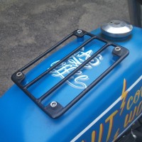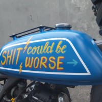 Setelah mendapatkan tampilan yang diinginkan, identitas motornya juga ditonjolkan melalui goresan kalimat singkat di bagian tangki Suzuki A100 yang dipilih Wisnu.