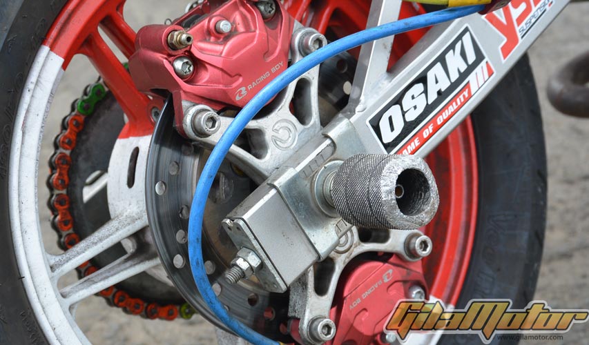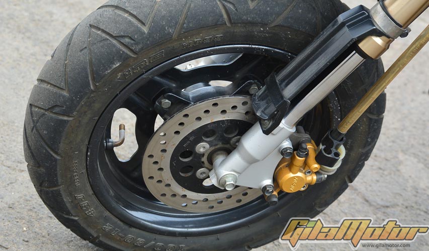 Pun demikian pada bagian kaki-kaki, velg 12 inci di depan masih mengusung standar. Tapi velg depan telah memakai velg milik KSR Pro yang dikawal dua kaliper rem dari Racing Boy.