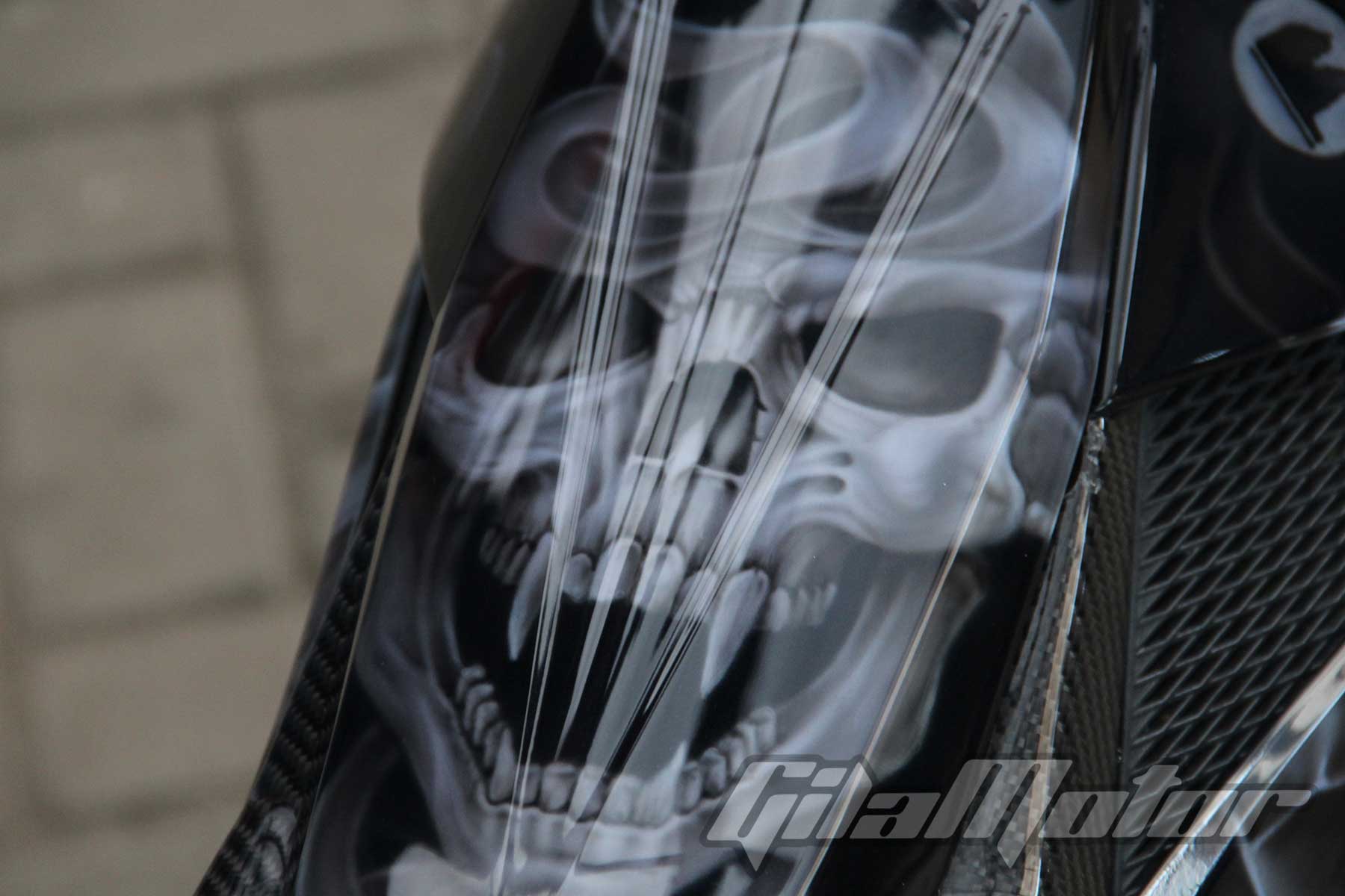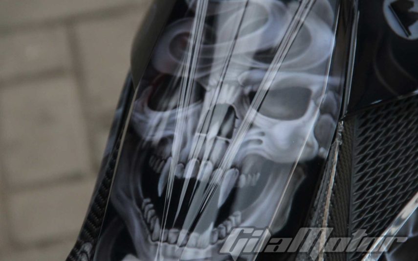 Walaupun terlihat simpel, nyatanya dalam proses pengerjaan motor ini terbilang sulit loh Gilmoters. Pasalnya detail tengkorak harus tampak jelas meskipun di media yang kecil. “Bodi Satria F150 kan kecil dan punya sudut-sudut tajam. Jadi cukup sulit saat pengerjaannya,” tambah Kelly.